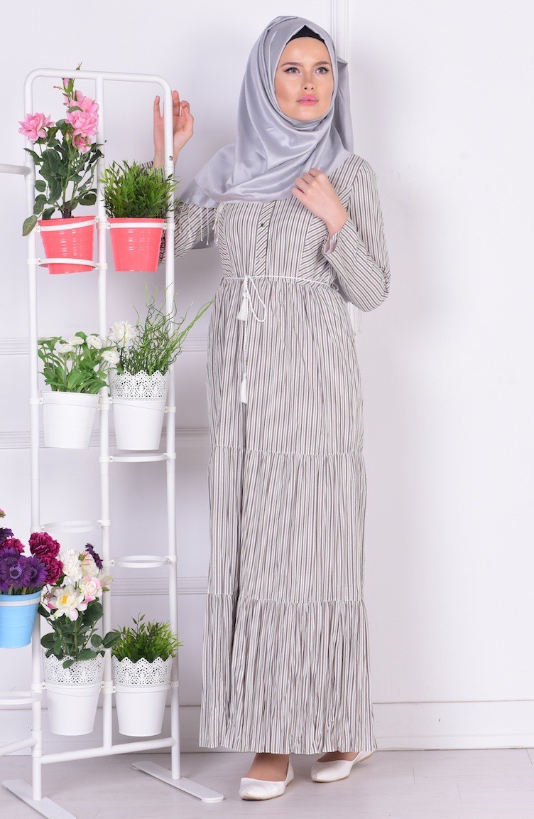 Cizgili Koton Elbise 6439 04 Kahverengi Krem Sefamerve