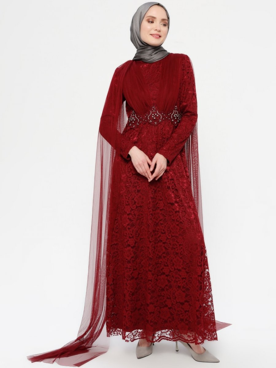 Ayse Melek Tasarim Pelerin Aplikeli Dantelli Bordo Abiye Elbise
